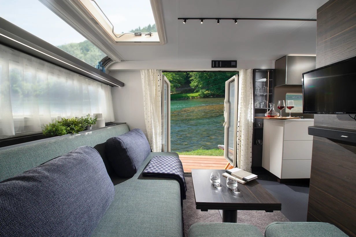 Zwei große Panorama-Schiebetüren im Wohn- und Schlafbereich schaffen ein beeindruckendes Raumgefühl und verbinden den Innenraum fließend mit der Umgebung.