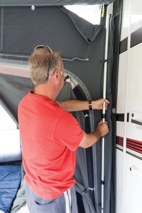 Die meisten unserer Vorzelte werden mit eingenähten Andrückpolstern, die den Spalt zwischen Vorzelt und Caravan abdichten geliefert. Diese Dichtung kann verstärkt werden, indem Sie ein Set mit hinteren senkrechten Stangen verwenden. Dieses Set ist in Aluminium erhältlich.