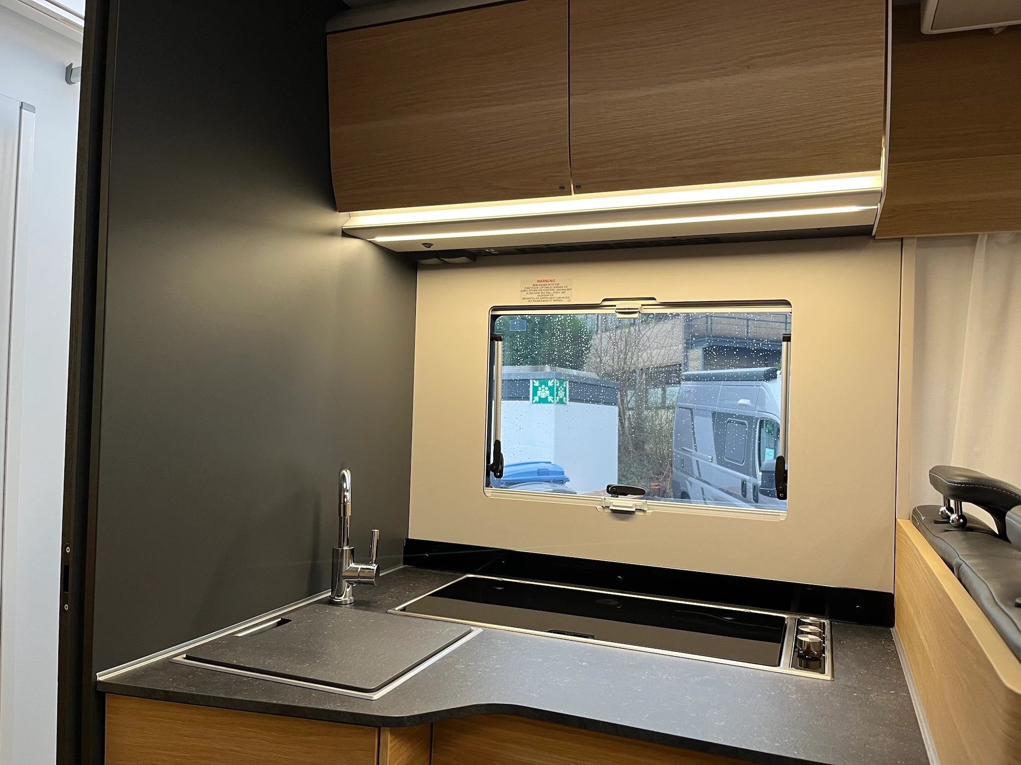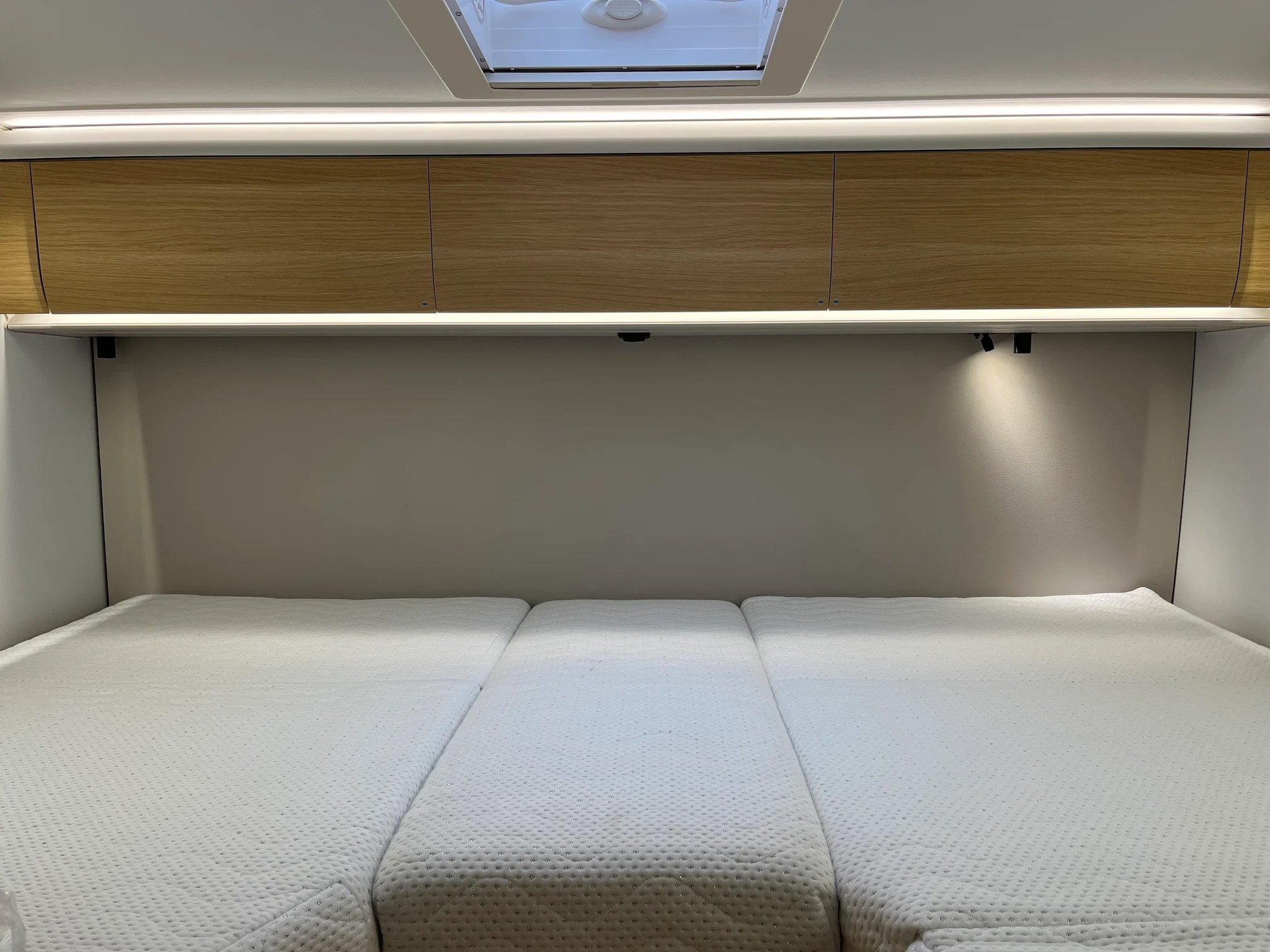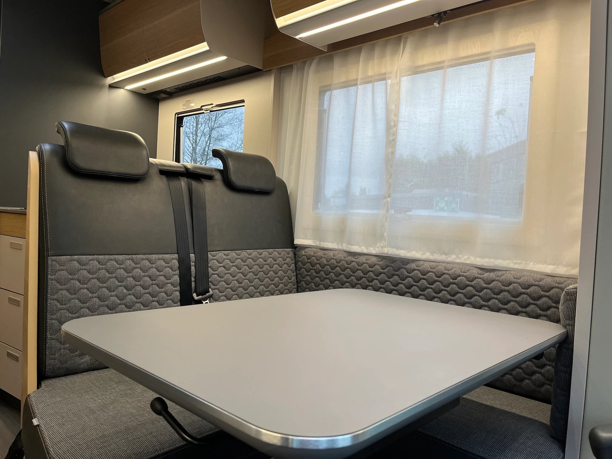 Dank des elektrisch absenkbaren Hubbetts und der Einzelbetten im Heck lässt sich der Raum flexibel nutzen – egal, ob du gemütlich entspannen oder unterwegs arbeitest.
