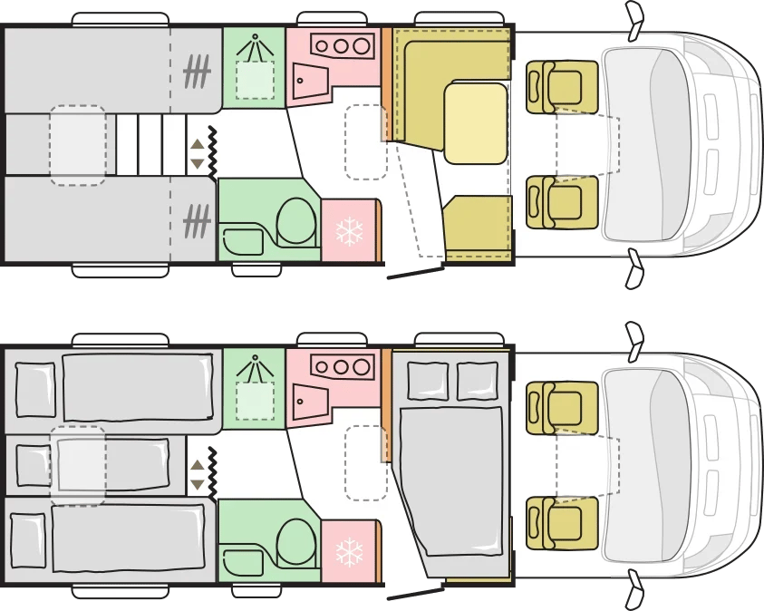 • Zwei Einzelbetten im Heck: 200x80 cm, 195x80 cm, 180x40 cm