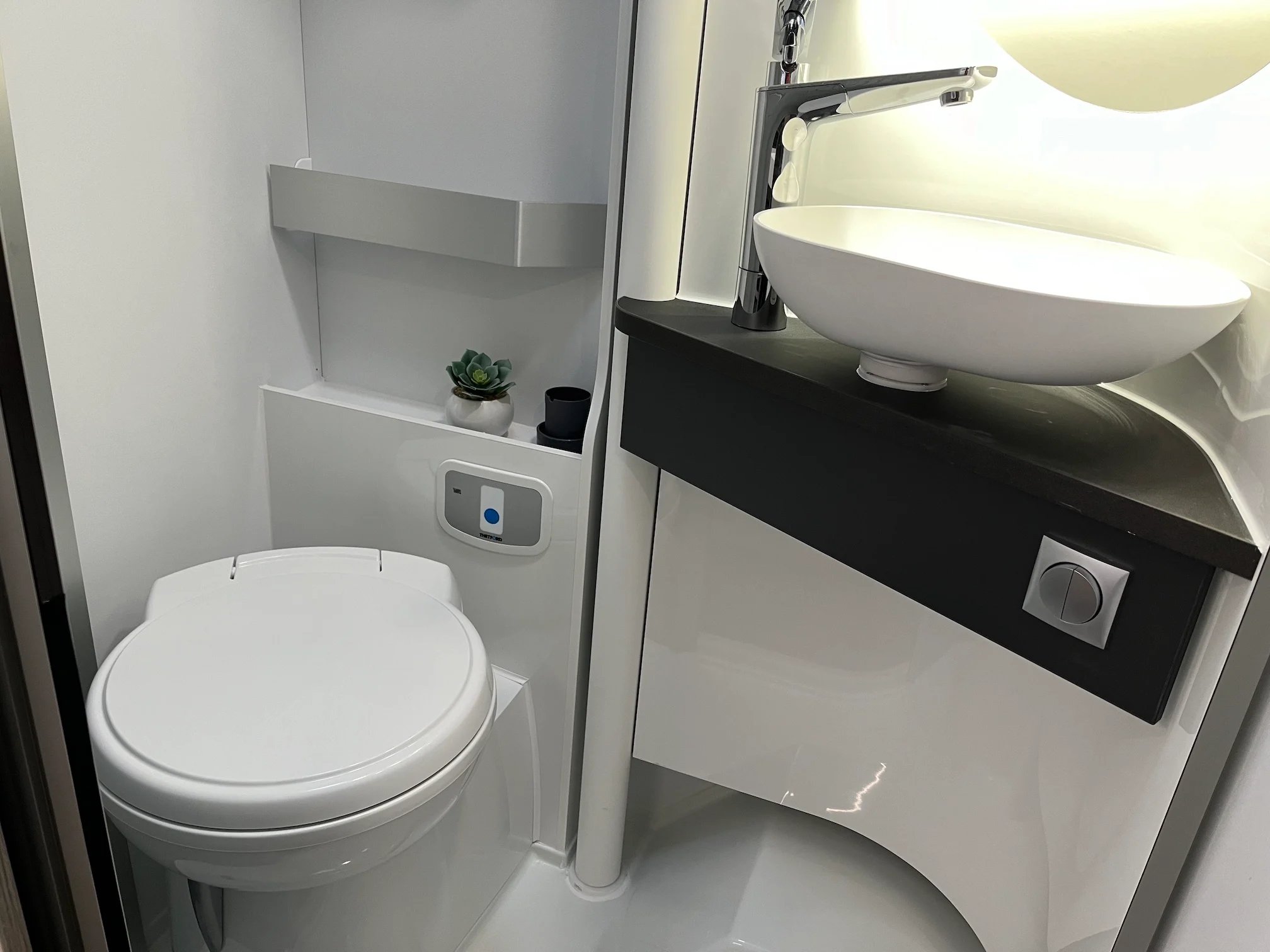 - Stromversorgung: Landversorgung über 230V, Bordversorgung aus 12 V Batterie, Freistehen möglich
