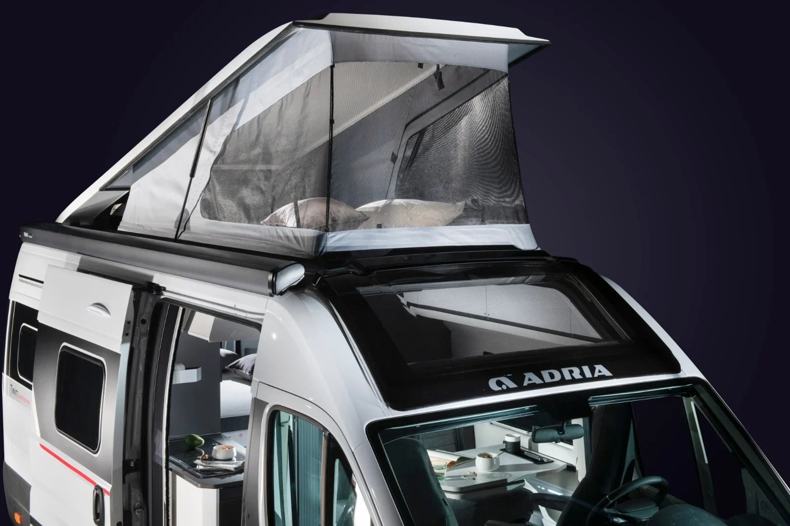 Vorhang auf für den neuen TWIN Sports 640 SGX, den TWIN Supreme mit einem voll integrierten und aerodynamischen Austelldach mit Schlafbereich in exklusivem Adria-Design! Ein Adria Kastenwagen ideal für Outdoor-Enthusiasten und Familien. Mit mehr Platz, mehr Stauraum, mehr Kopffreiheit. Und dank des Adria SunRoofs® mit mehr natürlichem Licht. Und alles so designed, dass sogar eine Klimnaanlage oder eine Midi-Heki Dachhaube hinten und eine auf dem Dach montierte Markise möglich sind.