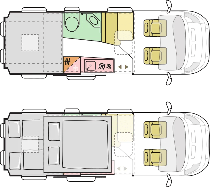 • Badezimmer: Das Duplex-Badezimmer verfügt über eine schwenkbare Wand, die eine vollwertige Duschkabine bildet, sowie eine Thetford-Kassettentoilette und ein modernes Waschbecken.