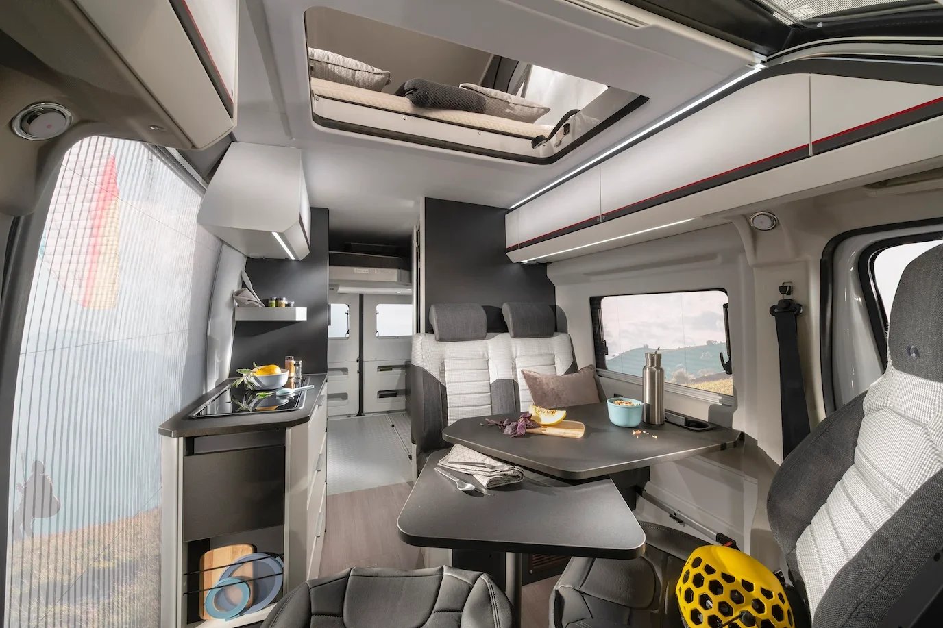 Der Innenraum des Twin Sports 640 SLB ist großzügig und durchdacht gestaltet, um den Komfort eines Wohnmobils mit der Funktionalität eines Kastenwagens zu vereinen. Der Wohnbereich ist offen und luftig, mit einer komfortablen Dinette, die ausreichend Platz für Mahlzeiten und Entspannung bietet. Die drehbaren Vordersitze erweitern den Wohnbereich und schaffen zusätzlichen Platz zum Sitzen oder Entspannen.